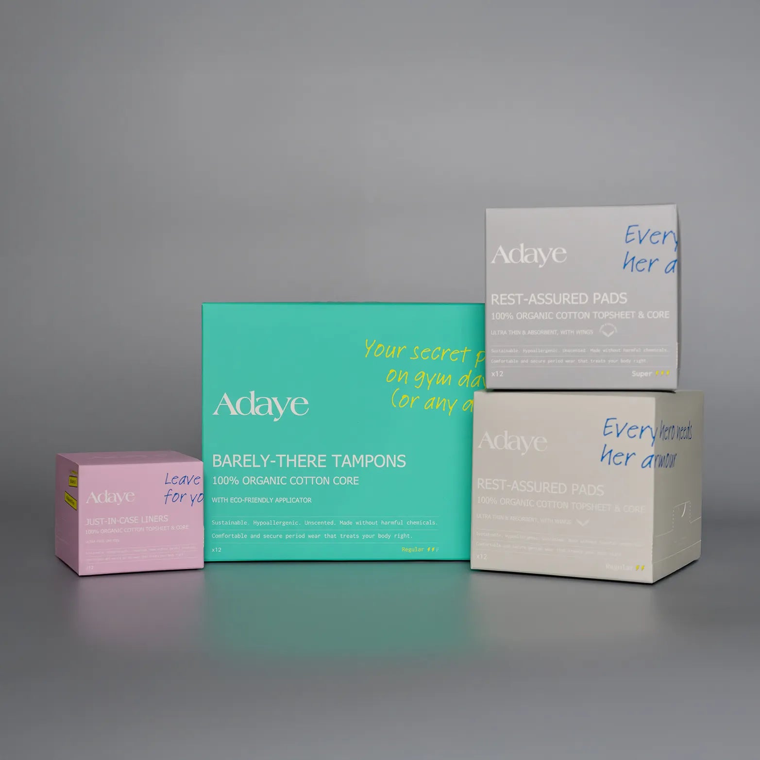 Our pads are designed with extra absorbent layers to provide comprehensive protection from all angles, and our tampons gently expand to fit you perfectly and provide protection from all angles.