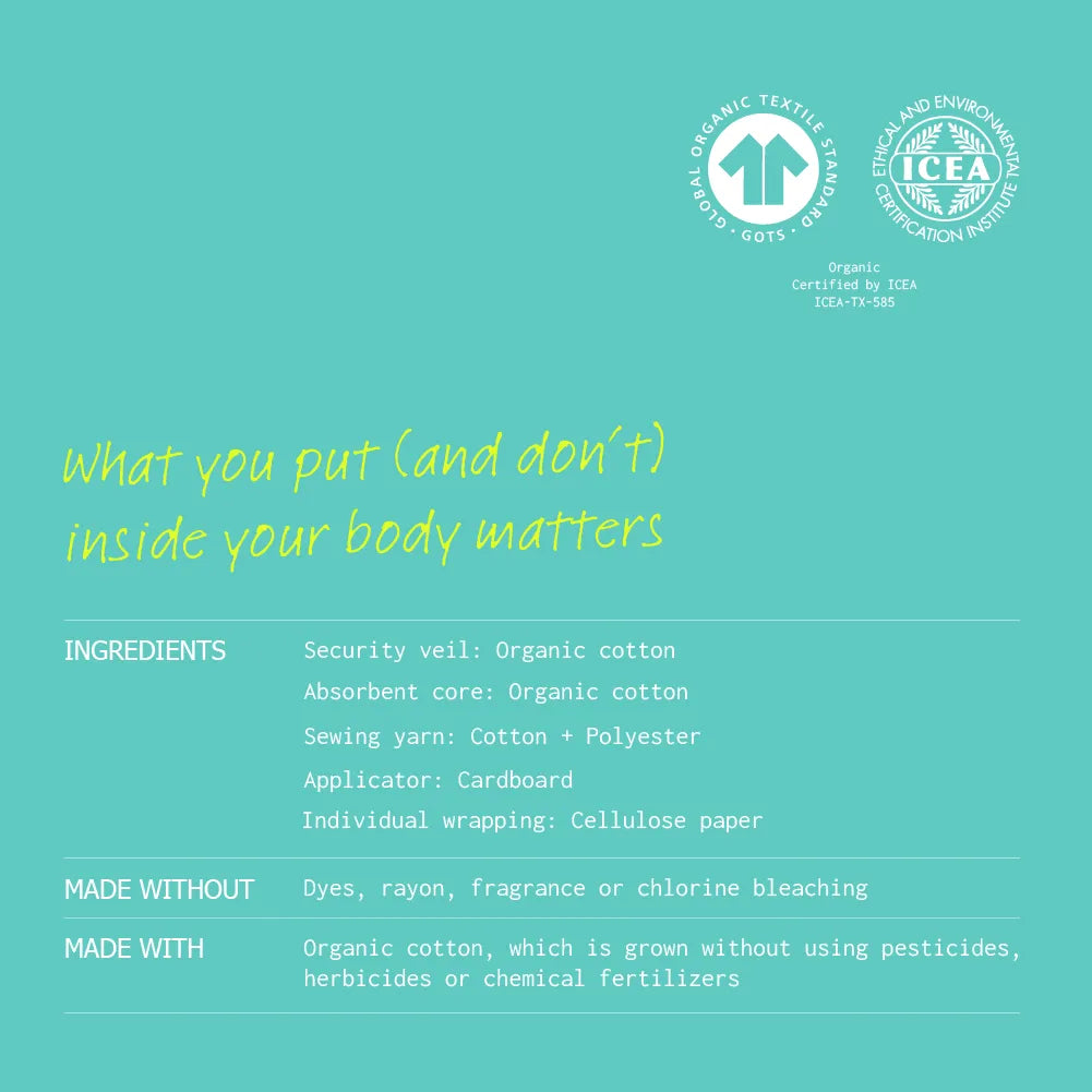 While many brands use organic cotton only for the core of their tampons, I go the extra mile. My security veil — the outer layer that holds the fibers in place — is also 100% organic cotton.